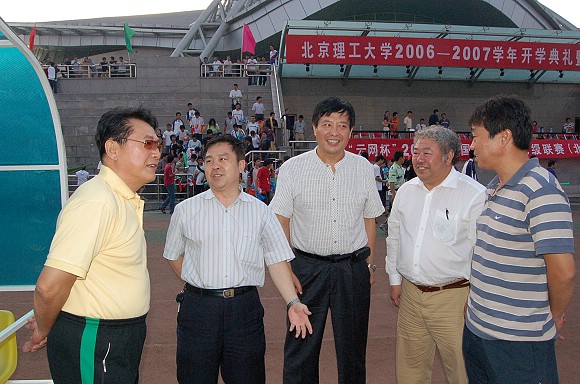 中场休息时,匡镜明校长在副书记、副校长杨宾的陪同下,来到教练席与足球队总教练金志扬交流,他鼓励全队继续努力,争取扩大战果,打好下半场的比赛。