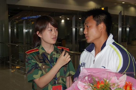 足球队长袁微在接受校学生电视台的采访。