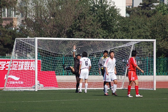 青岛大学队后卫眼见无法阻挡这个势在必得的进球,只好从后面将袁微放倒在地,不但被裁判红牌罚下,我队也获得了一次点球的机会。点球由上半场的进球功臣王绪主罚,可惜皮球打的太正,被对方守门员的腿部挡出界外,我方失去了继续扩大比分的机会。