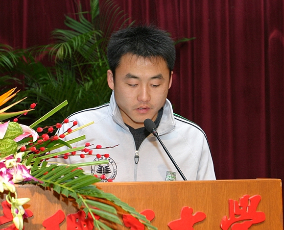 党委副书记、副校长杨宾代表学校宣读了表彰决定。足球队在乙级联赛的成功,证明了我校足球队的实力,展现了当代大学生良好的精神风貌和个人品质,是学校凝聚力的体现,已成为校园文化建设的重要内容。学校决定对足球队全体成员予以表彰,希望足球队再接再厉,勇于开拓,不断进取,在今后的各项赛事中取得更大成绩,再创新的辉煌。学校号召全校师生向足球队学习,继续弘扬延安精神和“两弹一星”精神,践行社会主义荣辱观,为学校高水平研究型大学建设而努力奋斗。