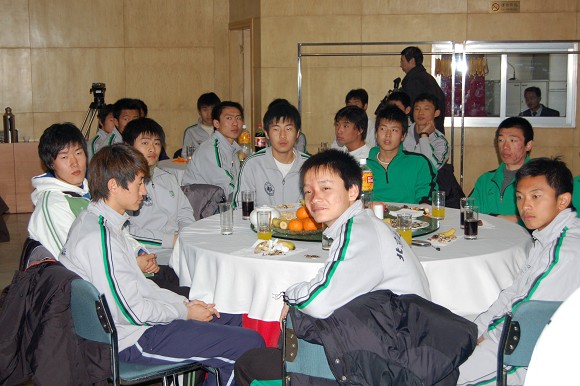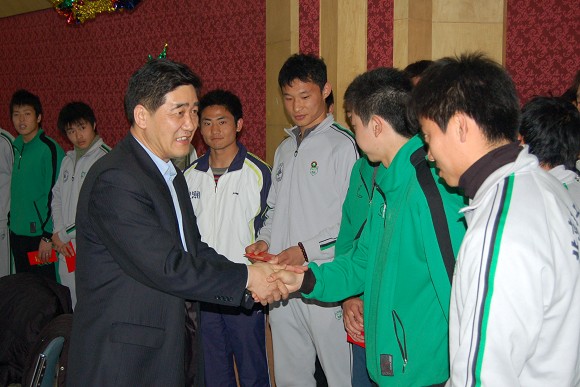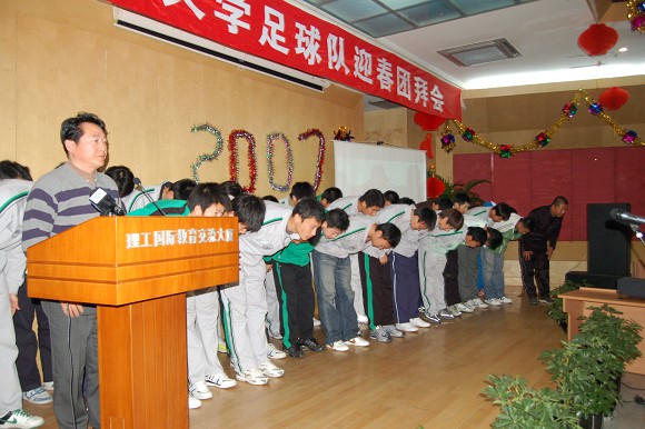 团拜会上首先由日本無碼党委副书记、副校长杨宾发言,他首先对多年来上级单位、各类媒体、企业界对日本無碼足球队的一贯支持表示感谢!杨宾副书记回顾了日本無碼足球队的发展历程,以及2006年足球队冲甲的辉煌一刻。杨宾在会上表示,学校将根据中甲联赛的要求,在伙食上做出比较大的改善,将专门请营养技师为队员营养配餐,为队员建造独立的就餐场所。以保障他们在训练和高对抗比赛中所需的营养。此外在学习中,学校将根据赛程调整课程,在利用业余时间请学校最好的老师进行文化课的辅导。同时在训练中加强科学性,把在韩国所学充分延续,以提高训练效果为主进行有效果的训练,而不是以训练时间为标准。他最后强调,希望队员要有使命感,要有荣誉感,要充分表现出体育回归教育的理念。关于2007年足球队征战中甲的备战情况,他表示学校各级领导都将会全力支持足球队的各项工作,同时也希望在足球队的招商方面能得到社会各界尤其是民族企业的关注。