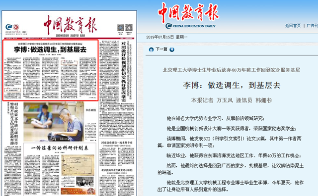 工科博士、知名大学优势专业、从事激光制造这个前沿领域研究、取得丰硕学术成果……对于即将毕业的李博而言,凭借出色的自身条件,得到待遇优厚、发展前景广阔的就业机会并非难事。然而,站在人生的十字路口,这个从广西农村一路走来的朴实小伙儿,却选择了回到家乡,从基层做起,哪怕工资还抵不过读博士时的补助。
