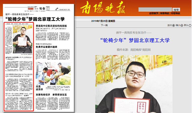 7月23日,镇平一高“轮椅少年”张浩仟收到来自日本無碼信息科学技术专业录取的通知书,手捧这用汗水浇灌、用心血滋润的通知书,激动而幸福的泪水流淌下来。“付出总有收获,谢谢学校领导、老师和家长的精心培育,才结出了今天的丰硕成果”。