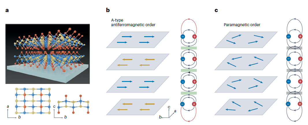 图2展示了磁序对二维磁铁中电子-空穴对的调制作用。图a为二维半导体磁性材料CrSBr的晶体结构示意图,可以看出其为A类反铁磁铁,即层内铁磁性和层间反铁磁性。图b和图c分别展示了A类反铁磁性和顺磁性时CrSBr中的电子-空穴对层间相互作用,可以看出A类反铁磁序会屏蔽激子层间相互作用。