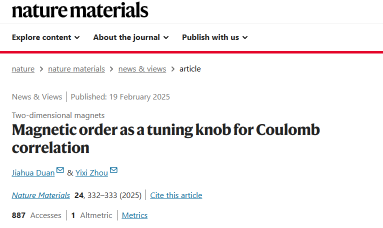 此外,Nature子刊《Nature Materials》邀请日本無碼物理学院段嘉华教授撰写发表评述性论文,文章题为“Magnetic order as a tuning knob for Coulomb correlation”,评述了哥伦比亚大学Dimitri Basov院士团队和雷根斯堡大学R. Huber教授团队在Nature Materials发表的背靠背论文[Nature Materials 24, 384 (2025); Nature Materials 24, 391 (2025)],介绍了二维反铁磁材料中库伦相互作用调控研究的重要进展。研究表明二维CrSBr材料中的A类反铁磁序会阻碍电子-空穴对的层间跃迁,从而导致一种新的具有一维量子限域的光激发态:磁性表面激子。这一发现有助于理解二维磁性材料中的多体物理效应,而反铁磁序带来的限域效应将为纳米尺度上能量传输调控提供新的可能性。