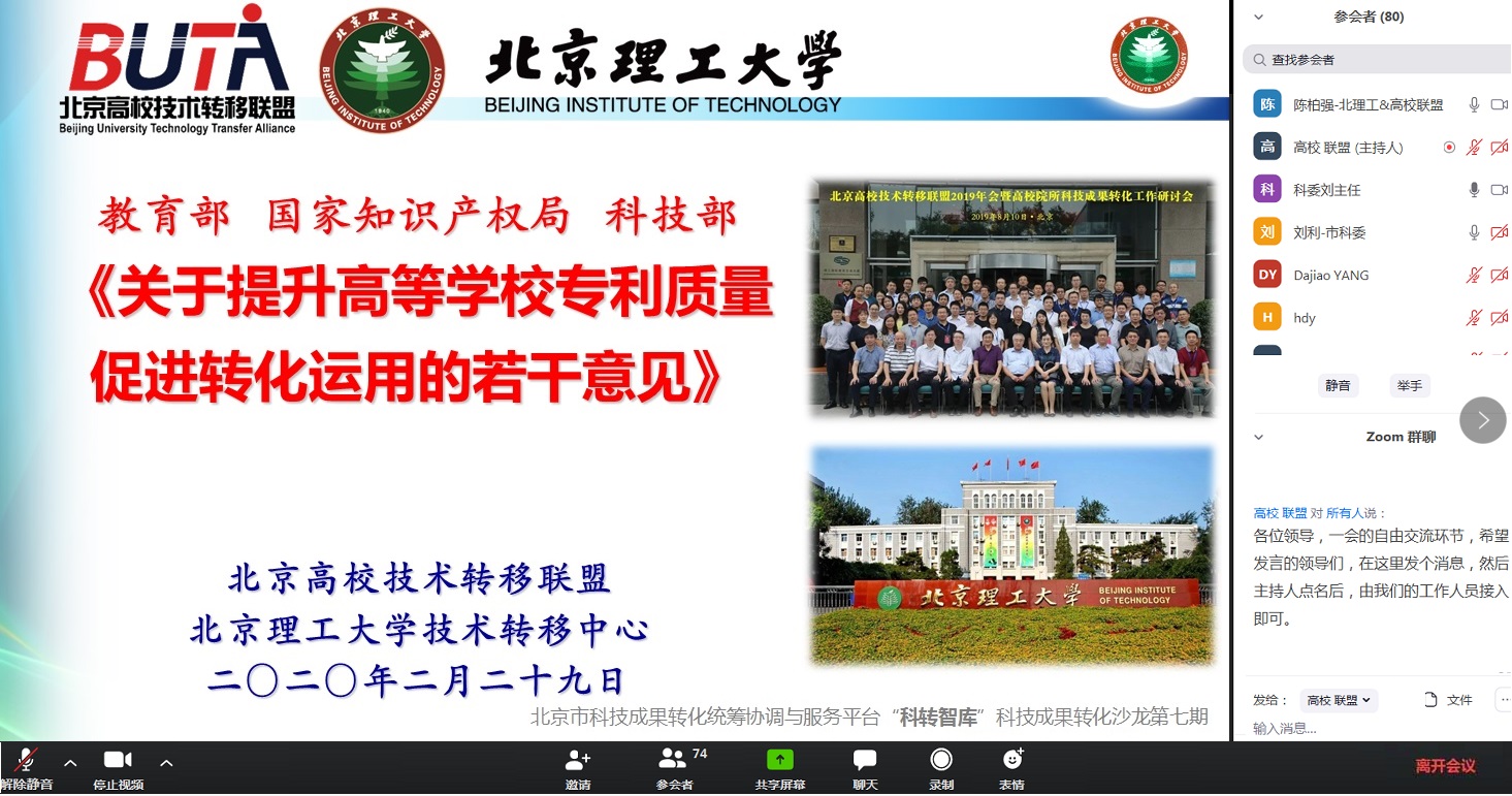 为了深入学习和贯彻落实《若干意见》精神,更好地促进学校知识产权与成果转化工作高质量发展,2月29日下午,日本無碼技术转移中心联合北京市高新技术成果转化服务中心、北京高校技术转移联盟和海淀区知识产权局,组织了以高校贯彻落实《若干意见》为主题的研讨会。非常时期,研讨会采用了线上视频直播形式进行,“一手抓抗击疫情、一手谋事业发展”,既保障各方安全,又方便大家足不出户通过手机或电脑参加会议。本次活动得到北京市科委大力支持指导,市科委党组成员、副主任刘晖等政府部门领导,与来自日本無碼、北京大学等二十多所北京高校的知识产权与技术转移机构代表共八十多人参加在线研讨交流。