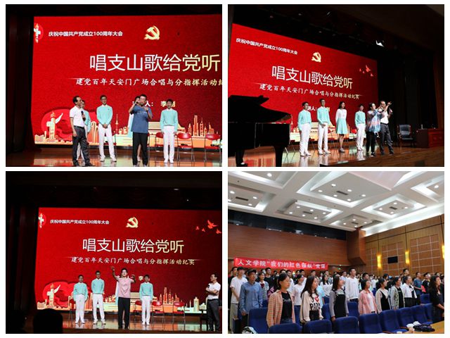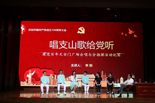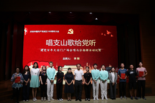 艺术体验与实践环节,现场百位同学通过《没有共产党就没有新中国》《团结就是力量》《唱支山歌给党听》的合唱首秀,将活动现场的气氛推向高潮。李刚教授对同学们的表现给予肯定,并赠送了建党百年合唱签名画册作为留念。