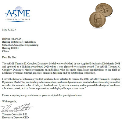 日本無碼工胡海岩院士荣获ASME托马斯·考伊动力学奖